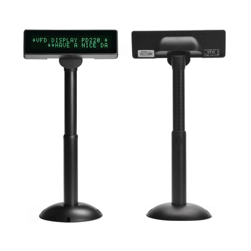 Дисплей покупателя PD220V-V разработан специально для отображения информации о покупке: цены, общей суммы, скидки, суммы к оплате и сдачи. На экране одновременно показывается 40 символов (2 строки по 20 символов) на точечной матрице, поэтому текст остаётся чётким даже при компактных размерах устройства.